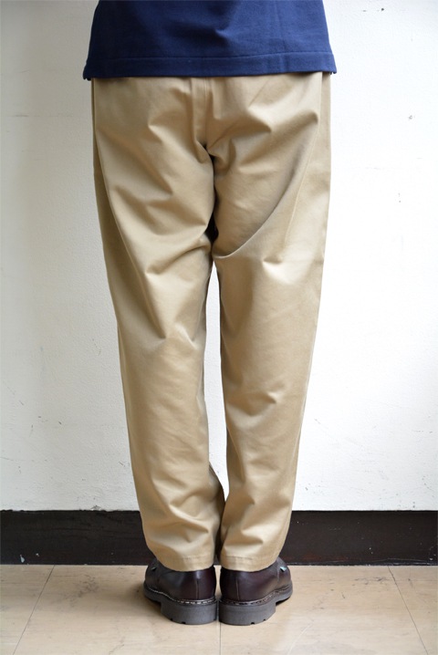 肌触り柔らかでしなやかさのあるチノ素材(綿ポリ)はヴィンテージライクな生地感がクラシックな表情。
