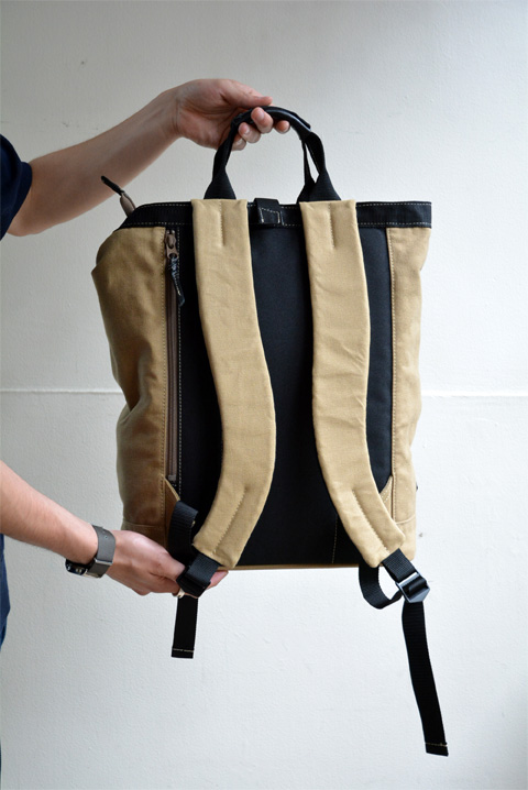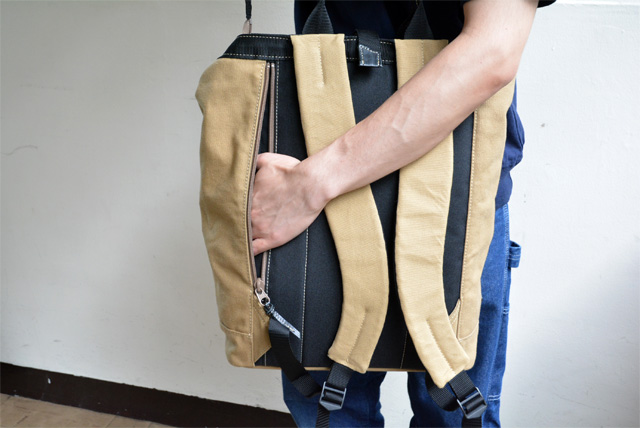 トートバッグとリュックサックの2way仕様になっておりますので、裏面はこんな感じです。背負っていても肩が痛くなりにくいようパットも厚みがあります。