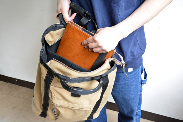 内側のポケットはメインとサブに分かれていて奥側にPC用の収納スペースも完備してあるので仕事用にも使えますね。写真はパソコンではなくタブレットを収納しようとしてる画ですが。。