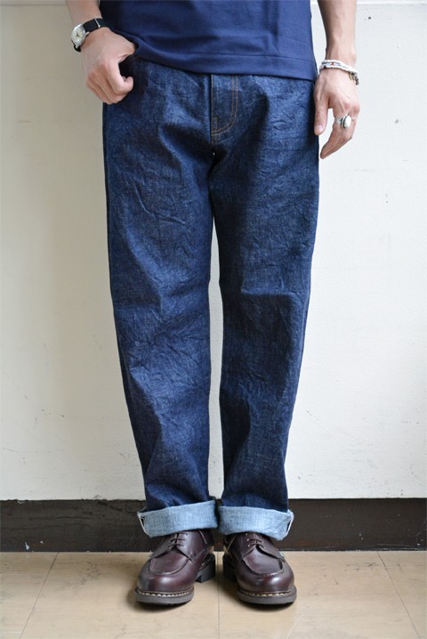 夏もジーパン!!という方にも試して欲しいワイドシルエットのデニム。「アメリカから輸入されたデニムを日本の職人が模倣して、日本で初めて作られたデニム」を再現したものでございます。