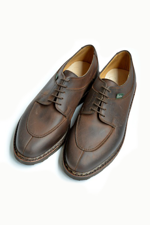 林師匠にお薦めいただきました『Paraboot(パラブーツ) AVIGNON(アヴィニョン) ヌバック』。「1足で2度おいしいやろ!グリコのキャラメルや!」と申されておりました。どういう意味かと申しますと、2,3年はオイルヌバックのままで傷や汚れを気にせずお召し頂きます。そろそろ綺麗に履きたいなという頃にヌバックにクリーム付けて磨くと摩訶不思議。ピカピカになります。これが1足で2度おいしい理由でございます。しかもAVIGNON(アヴィニョン)は踝(くるぶし)辺りが低めに作られておりますので、日本人の足によく合います。『Chambord(シャンボード)』とはまた一味違う味わいがございます。是非ともお試しくださいませ~!