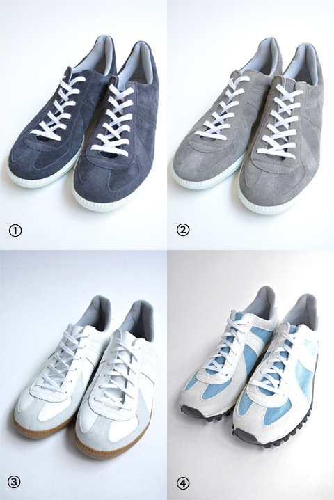 ドイツ軍のジャーマントレーナー、①スェード ネイビー、②スェード グレー、③レザー ホワイト、④デニム×スウェードです