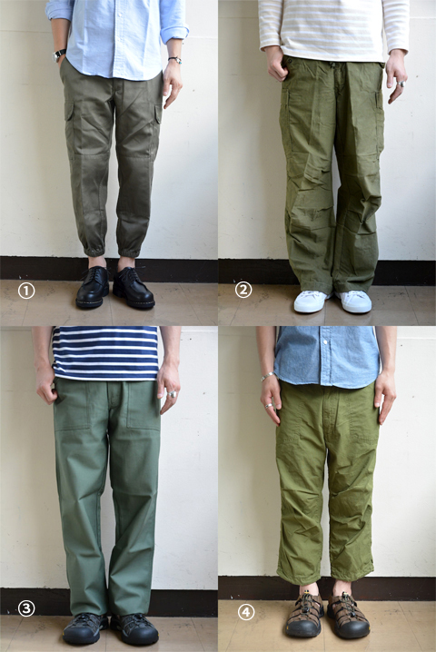 アーミーパンツは①フランス軍のF2、②アメリカ軍のM65、③Gung Ho(ガンホー) ベイカーパンツ、④F.O.B FACTORY(エフオービー ファクトリー)クルーザーパンツ 、などなど。