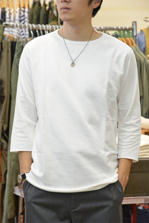 スピナーベイトの定番アイテム、ミニ裏毛ラグランクルー7分袖でございます。
