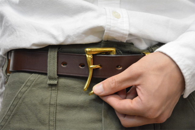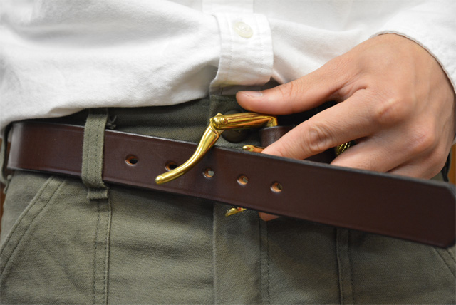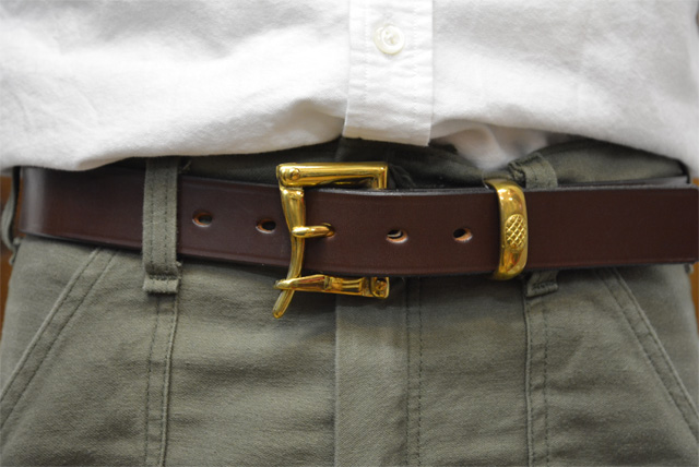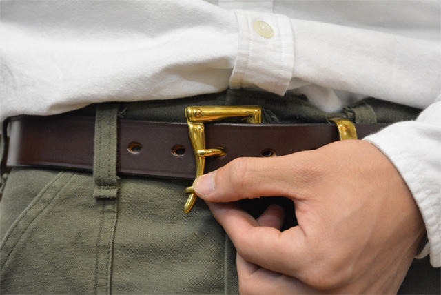 ブライドルレザーは初めのうちは硬いですが使い込むごとに、しなやかで美しい光沢のある表情へ。その堅牢さと美しい光沢が特徴的な革ですのでエイジングも楽しみです。ベルトが茶色の方はバックルが真鍮。黒色の方はシルバーになっております。