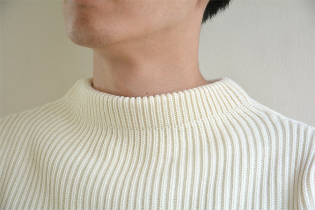 畔編み(リブ編み)のスッキリとしたデザインは、あえて中にシャツを着ない着方がお気に入りです。