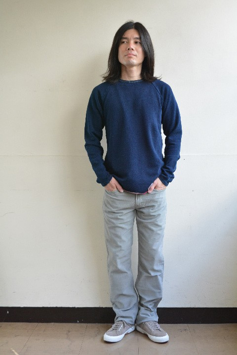 インディゴ染めのカットソーという柔軟性のあるアイテムなだけに、コーディネートの幅は広い。そして大体が様になる。ミリタリーミックスで軍パンなどと合わせて頂くのももちろんカッコいいですが、今シーズンは「コーデュロイジーンズ」に合わせて頂くのがおすすめです。洋服を通じて四季をしっかり楽しんで頂くのが粋じゃないですか。シーズンレスのインディゴには、季節感のある「コーデュロイ」が丁度いい。