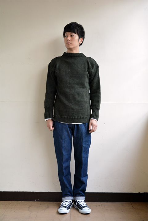 定番のガンジーセーター。今年はナウンを代表するスピンドルパンツに合わせるところから始めたい。リラックスしたZABOU流2016AWアメカジスタイル2です。