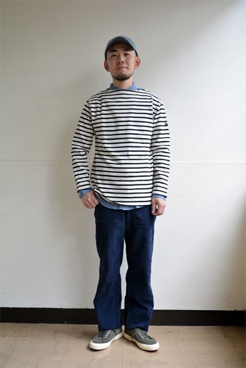 ザボスタ定番のシャツonセントジェームス。大きめのサイズ選びがポイントです。第2弾では、キーアイテム「コーデュロイ」のベイカーパンツ。ルーズなバランスでリラックス感が◎