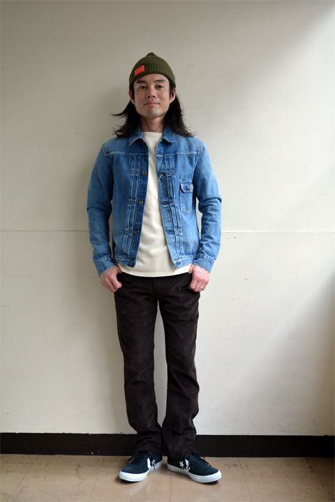 90年代のアメカジスタイルもまた新鮮。色の抜けたインディゴとこげ茶色のコーデュロイの組み合わせがポイント。