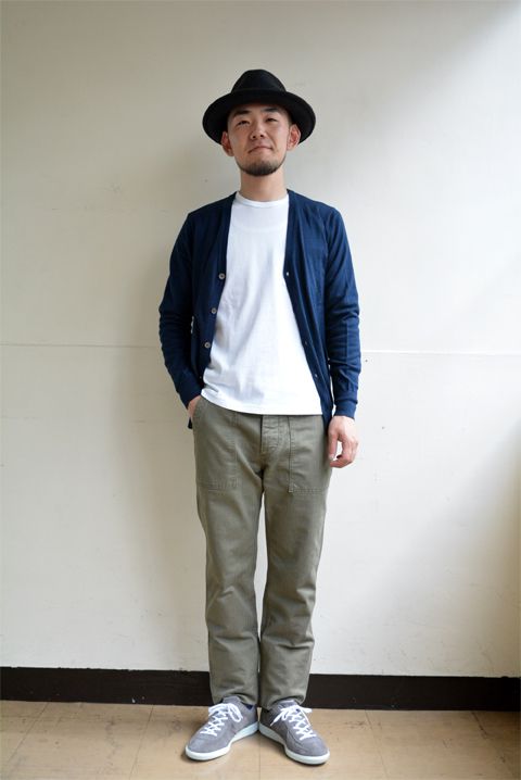 きれい目なカーディガンスタイルには、細めのパンツが好相性。ベイカーパンツで「ミリタリーミックス」すればグッとカジュアルにもなりますね。フェルトのハットとスウェードのスニーカーで季節を感じる小物のチョイスもお忘れなく。