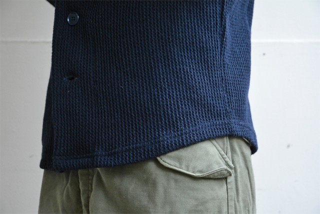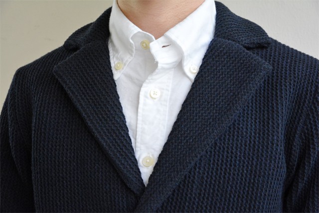 テーラードの襟元がカチッとした印象を持たせてくれて、ワッフルのようなラッセル編みに裾のラウンドがカジュアルな印象を持たせてくれる。この品の良さと力の抜け具合が絶妙なカーディガンなんです。