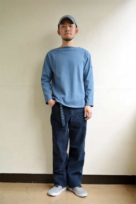 ZABOU styleの定番、バスクシャツ×ワークパンツ。ブルーグラデーションで決め込んだ足下は、アメリカ買い付け、ライトグレーのVANSがポイント。