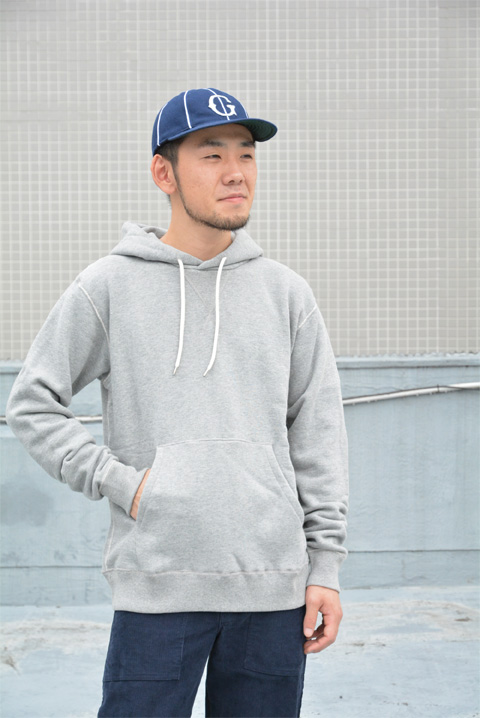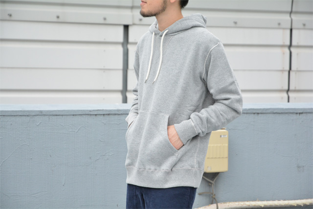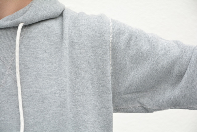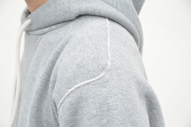 スウェットは僕好みのアイテムでして、優しい風合いにしっとり柔らかで弾力のある生地、そして動きやすくてカジュアルな見た目。アクロスザヴィンテージオリジナルのスウェットパーカーは、肩や脇などの腕回り、裾や袖のリブ、フードまでもフラットシーマ(生地と生地がフラットな状態で縫製されている)という縫製で作られているので、ゴロつきがなく着心地が快適なんです。