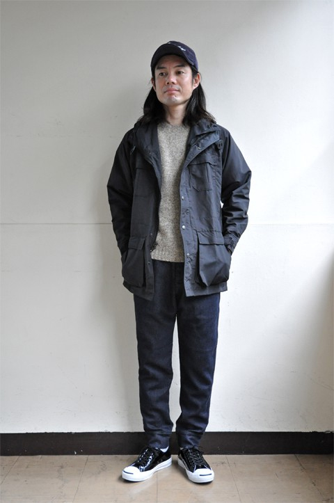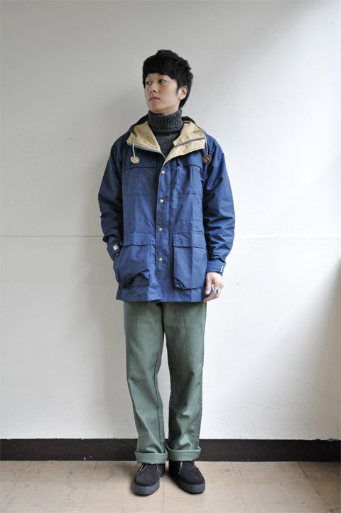 今となってはローテクの極みとも言えファッション化されたと言っても過言でない生地ですが、当時は最先端。コットン60%、ナイロン 40%は黄金比。コットン100% よりもゴワつかず、ナイロン100% よりも摩擦に強い、水分を吸うと横糸のコットン糸が膨張して織目を塞ぎ、防水・防風効果を高める事が画期的だった。独特の風合いと光沢、着るほどに味わいが増す60/40(ロクヨン)クロスは、決して色あせる事が無く、寧ろ安心感さえもあります。
