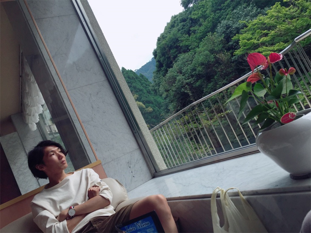 ↑宿泊先のホテルにて、偉そうに座る加茂。