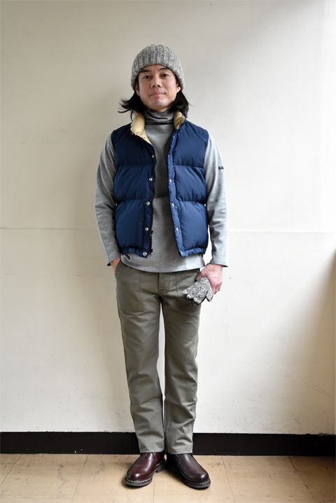 グースダウンがしっかり詰まったアメリカ製のダウンベスト。程良いボリュームが魅力のベストには縦のラインをスマートにするとバランスがいい。ウエッソンのインナーにはタートルカットソー、細めのパンツですっきりさせるのがポイント。