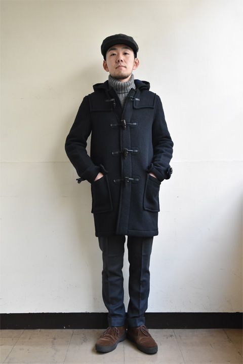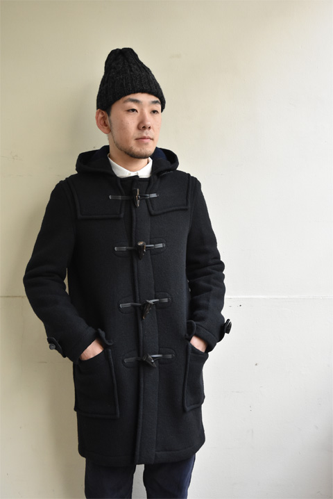 さて、本日のご紹介はGLOVERALL(グローバーオール)のニットダッフルコート。ウールメルトンもいいけど、こっちはニットだから柔らかくて軽いのが特徴的。デザインも今っぽくスッキリシルエット。定番のダッフルコートのディティールはそのままで安心感があり、丁寧なモノ作りはさすがですね。