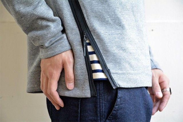 首元がすっぽりと覆われる高めのネック。デザイン性もさることながら保温性も抜群。右サイドのジッパーは着脱がし易い配慮とベンチレーションとしての機能性だけに止まらず、例えばインナーにボーダーのバスクシャツを着ることでアクセントにして頂くのもおすすめです。