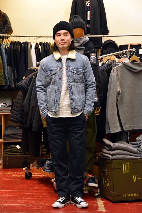 levisboagjac1_compressed●帽子 Saint James(セントジェームス)  ¥5,400- ●Gジャン LEVI'S(リーバイス)  サイズ:S  ¥14,040- ●カットソー SPINNER BAIT(スピナーベイト)  サイズ:40  ¥8,100- ●パンツ Double Tree(ダブルツリー)  サイズ:30  ¥14,040- ●シューズ CONVERSE(コンバース)  サイズ:8  ¥10,260- 身長171cm 体重58kg 足約26.5cm すでに着込んだかのような色の抜けたインディゴが良い雰囲気。 levisboagjac2_compressedLEVI'S(リーバイス) ボアGジャン  カラー:ミッドインディゴ  ¥14,040-
