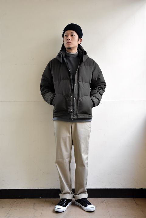 オリーブカラーが新鮮なダウンジャケットを主軸にアースカラーでシンプルにまとめたデイリーカジュアル。インナーのボートネックのセーターとタートルカットソーの重ね着がポイント。寒い冬にはプラスダウンジャケットで越冬間違いございません!シエラデザインズのは650フィルパワーと街では丁度いい暖かさ。