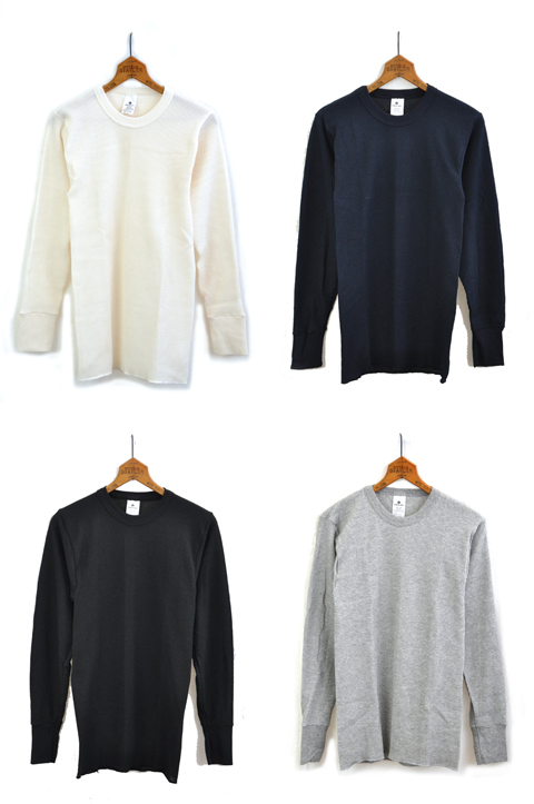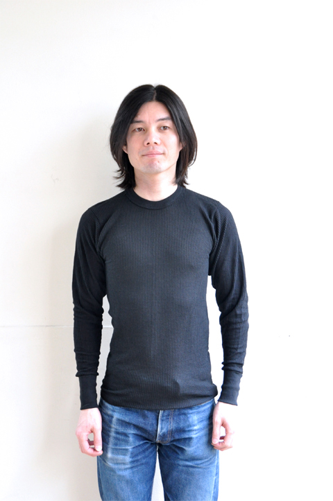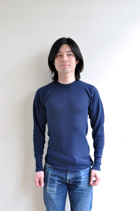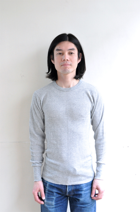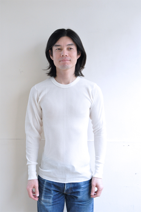 サーマルはご確認通り、凸凹とした生地の表情が非常に特徴的です。特にこのワッフルタイプが最も馴染みがあるのではないでしょうか。肌にピッタリ着て頂く事で暖かくお過ごし頂けます。ここに隙間が出来ちゃうとサーマルの良さが半減、暖かさが半減しますので、機能的なアンダーウェアとしてお楽しみ頂くには決して大きめでない方がおすすめです。