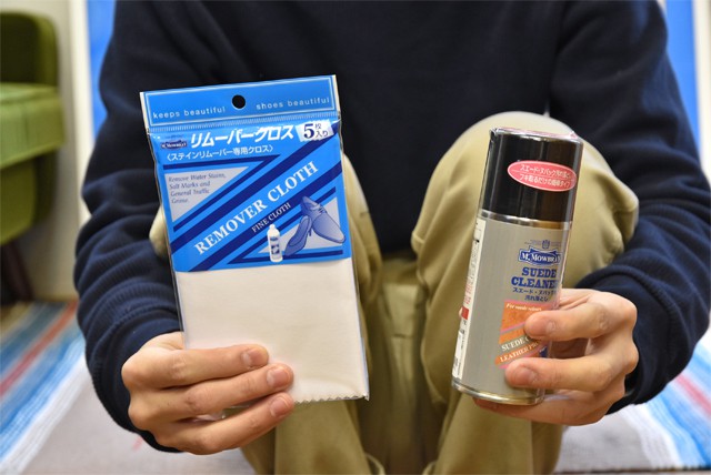 ブラッシングでは落ち切らない汚れがあればこのM.モゥブレィ スエードクリーナーを靴に振りかけ、M.モゥブレイ リムーバークロスで拭き取ってあげるといいですよ。