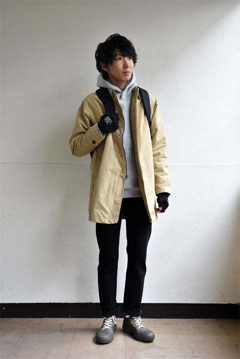 風を通さないハイテックなスウェットパーカとストレッチジーンズでアクティブなスポーツカジュアル。自転車に乗る時にも良さそうです。アウターにはマウンテンパーカなどでも良さそうですが、ここはシエラデザインズのタコマコートをセレクトしてクリーンに着たいですね。