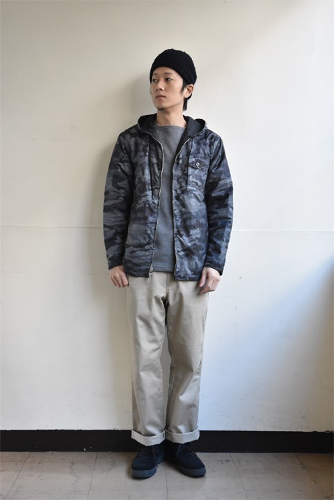 カモ柄と無地のリバーシブル。薄手の生地感でかさばらずシワになりにくいので鞄に入れてサッと羽織りやすいジャケットです。