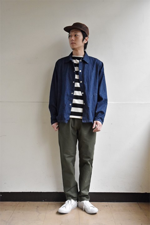 コチラはデニムタイプ。春物らしくコットン×リネンの素材です。 リネンが入ることで清涼感があり、生地の表面に凹凸が出来て表情の良い仕上がり。テロっとしなやかで柔らかい生地感、着用を重ねるごとに増す風合いも楽しみです。