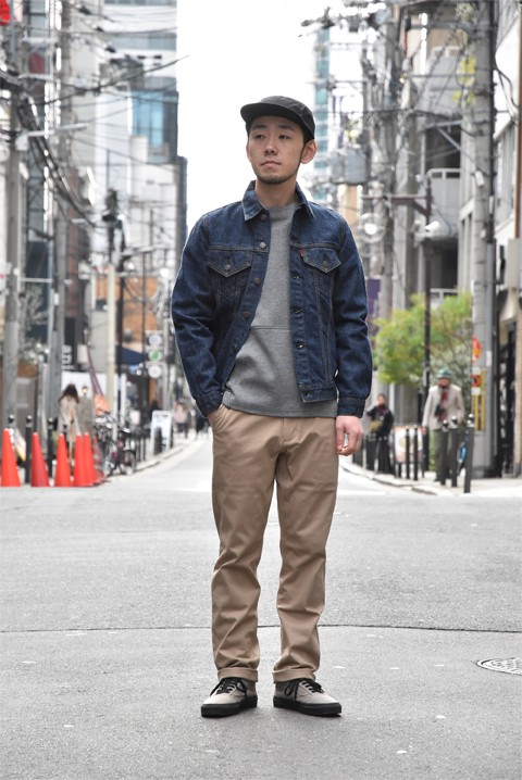 アメカジコーディネイト。グレーのスウェット、インディゴGジャン、チノパン、スニーカー、キャップ。