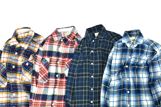 ●写真左側2色、ヴィンテージライクなチェックのネルシャツ。細かなディティールまでしっかり手の凝った作りになっています。また、シルエットがスッキリしていてインナー使いにも向いています。