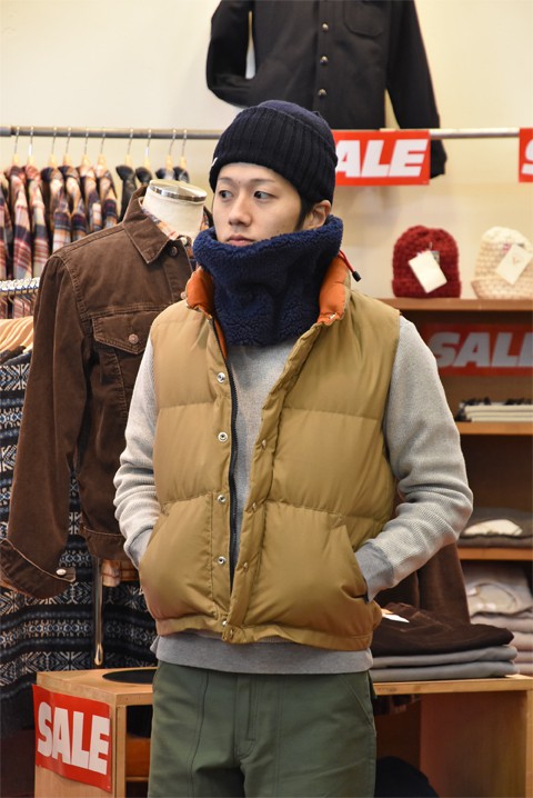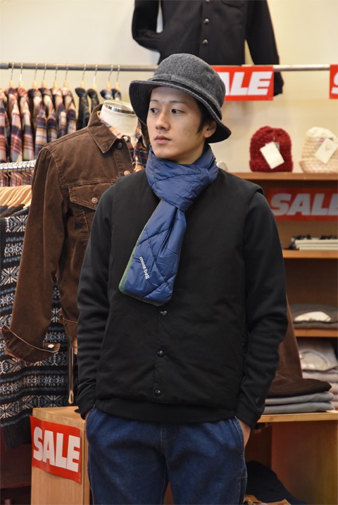 その名もダウンマフラー。そのまんまの意味で中綿にダウンを使用したマフラーです。実はスタッフの使用率も高いアイテムで、インナーダウンのように軽くて暖かい。巻いた時もコンパクトにおさまりストレスがありません。高品質なダウンを使用していながら超お手頃プライスも目を引くところ。