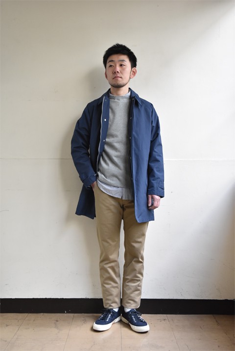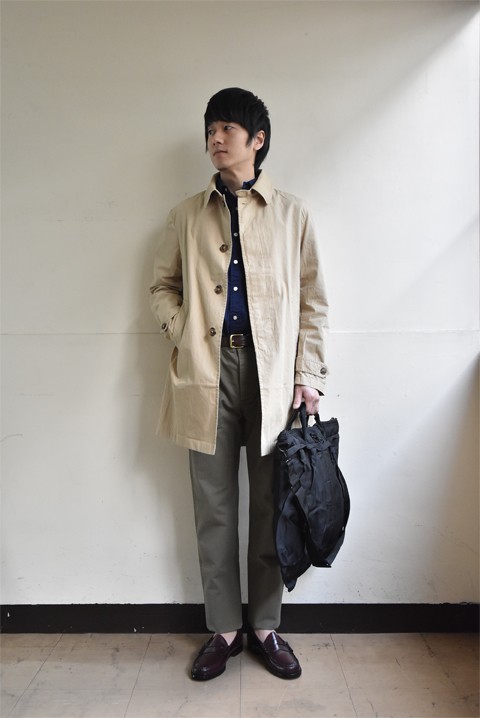 クリーンなイメージのステンカラーコートを男らしいスタイリングに。それも細身のベイカーパンツにローファーを合わせることで、カジュアルな中に品の良さを。それとこの春はカラーオックスシャツに挑戦してみるのもおもしろいかも?