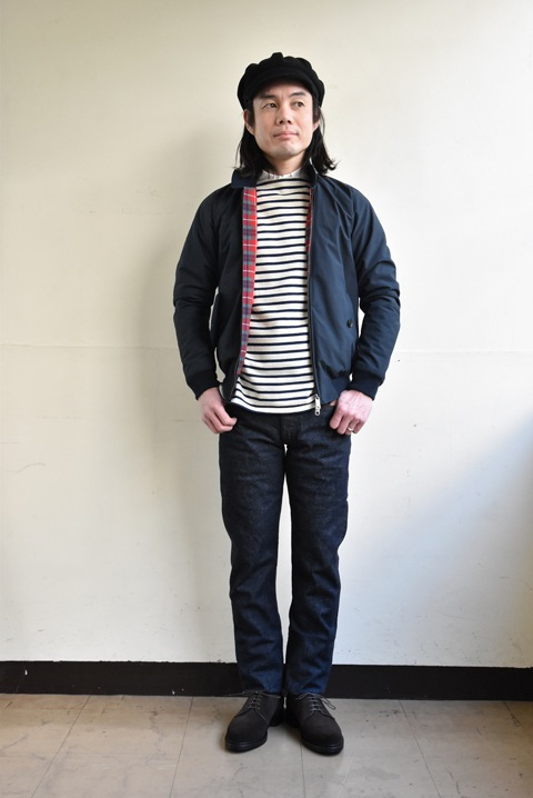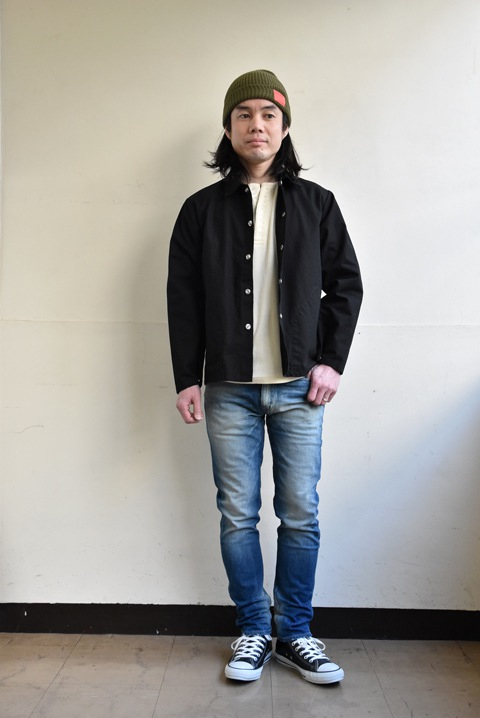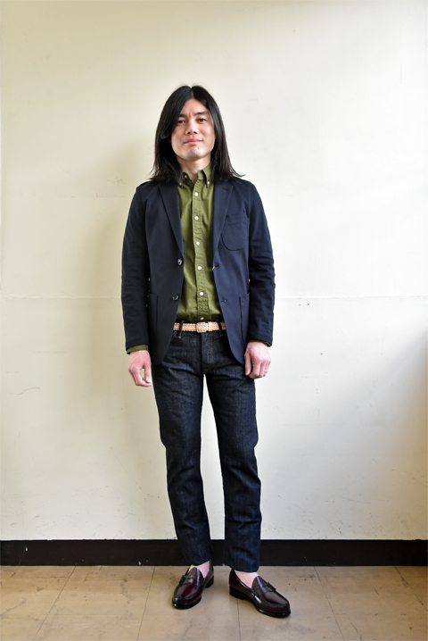 栽培から収穫まですべて手作業で行われるコートジボワール綿は、品質改良がなく最も原種に近い綿といわれているそうです。素朴な風合いが魅力の生地だかコーディネートもベーシックなアイテムで構成されたオーセンティックなスタイルが良く似合います。シルエットは、上記ジンバブエ×メンフィスコットンと同じくのテーパード。もちろんシュッとしてるのでトップスもそれに合わせて細めのバランスで合わせてみたいですね。