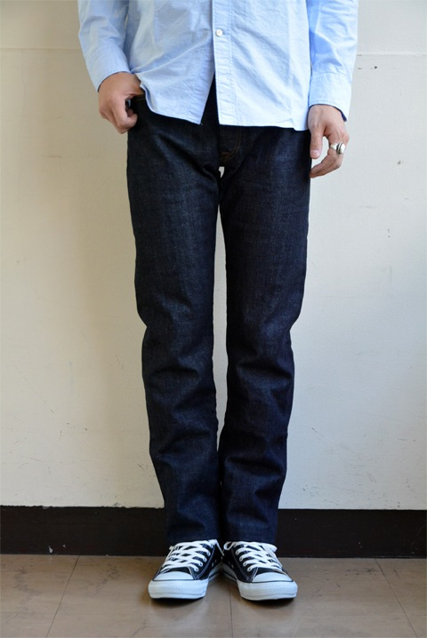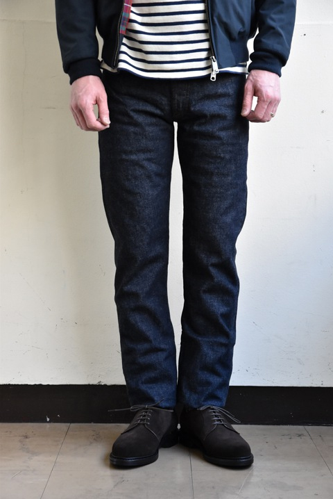 定番人気のコチラのジーンズは、14オンス。ジンバブエコットンとメンフィスコットンの混紡は、柔らかい風合いでありながらコシがある生地。ゴワゴワし過ぎる事無く穿きやすいけど本格的なジーンズのコシをしっかり感じて頂きながらデニムをお楽しみ頂けるのが特徴です。また、シルエットは細めのテーパード。ご覧の通りシュッとしていますのでクリーンなジャケットスタイルにもピッタリです。