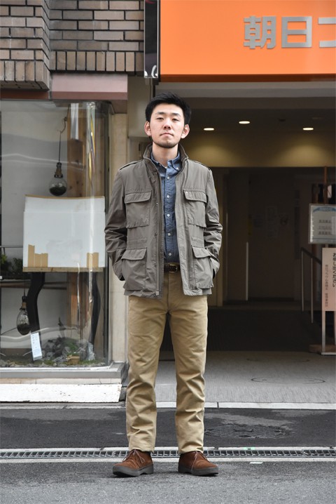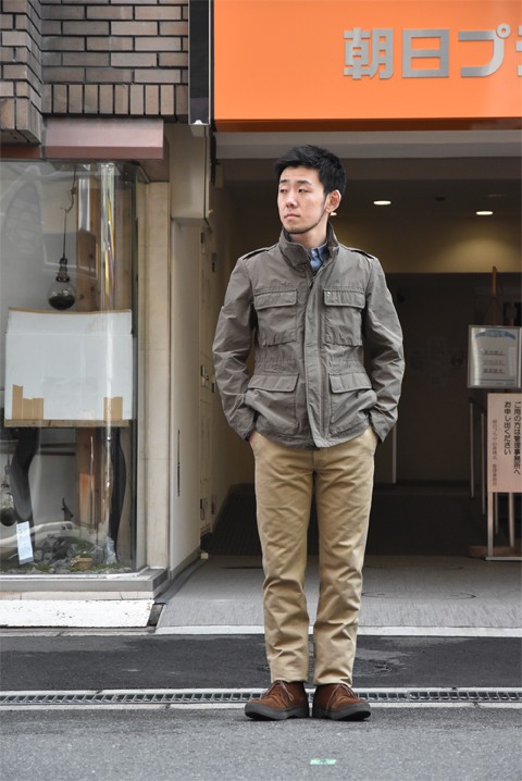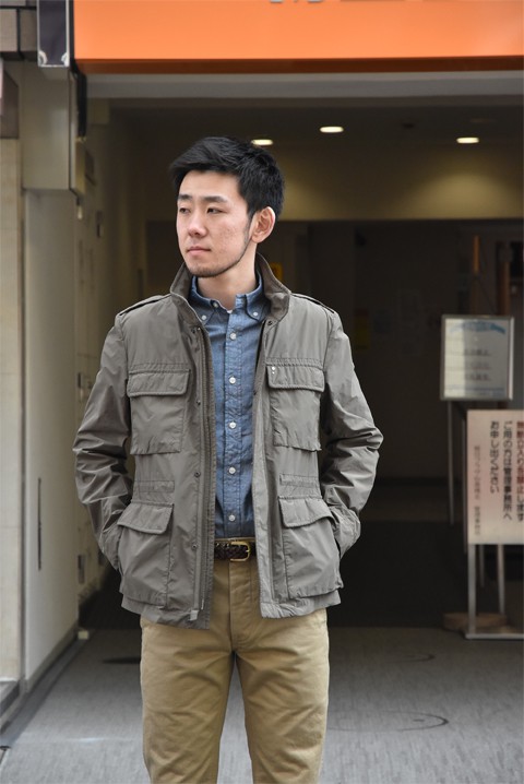形はミリタリージャケットの定番、M-65フィールドジャケット。男らしくカッコいいジャケットです。生地全体に見られるシワやパッカリングも雰囲気があって良し◎ 撥水加工を施しておりますので天気がイマイチな日でも大丈夫。