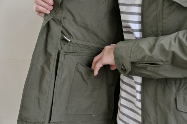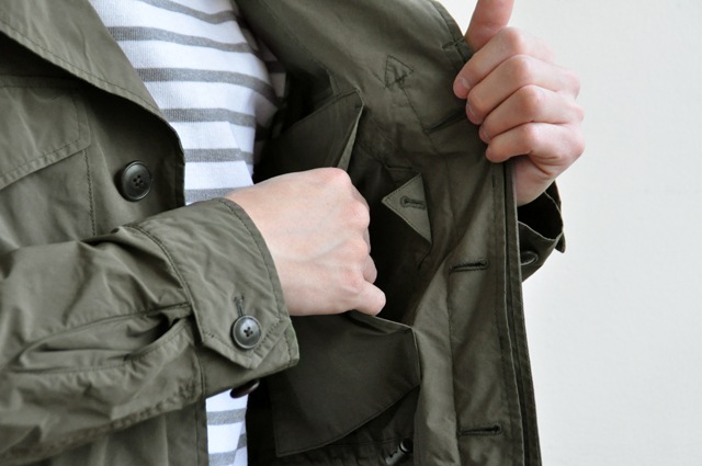 パリッとハリのあるポリエステル×ナイロン素材で、こちらもM-65同様撥水処理がなされた生地に。今日みたいに天気の優れない日でもとても着て頂きやすいです。通気性を良くするために脇部分にベンチレーションもございます。