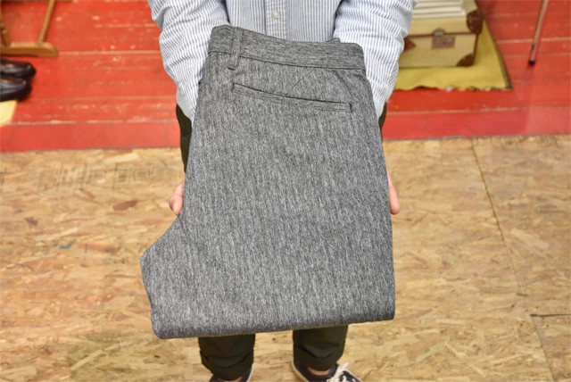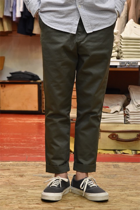この春からラインナップに加わったちょっと今気分なデザインのチノパン。お尻周りや太ももにはゆとりがあって、9分丈使用のテーパードが効いているパンツ。リラックスした感じなんだけども、ちゃんとしてる。生地と相まって品の良さが残る大人なパンツに仕上がっています。