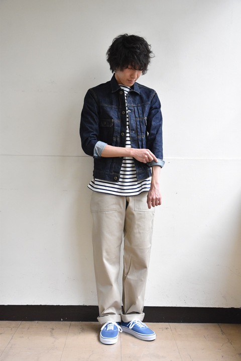 経年変化してきたらカジュアル感は増しますが、16.5ozの生地感がコーディネートに程よく重さをプラスしてくれるので子供っぽくなりすぎません。