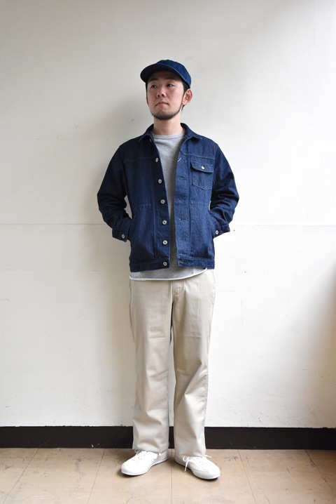 ウィークの定番ジャケット、ブルージーンズメモリー。 昔のラングラーのGジャンをベースにしたこちらの形。今回はデニム地。 表のステッチをボディと同色使いにしているのでスッキリとした表情でございます。その分裏のステッチは色使いで遊び心を。