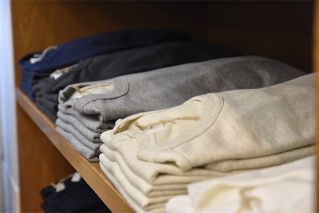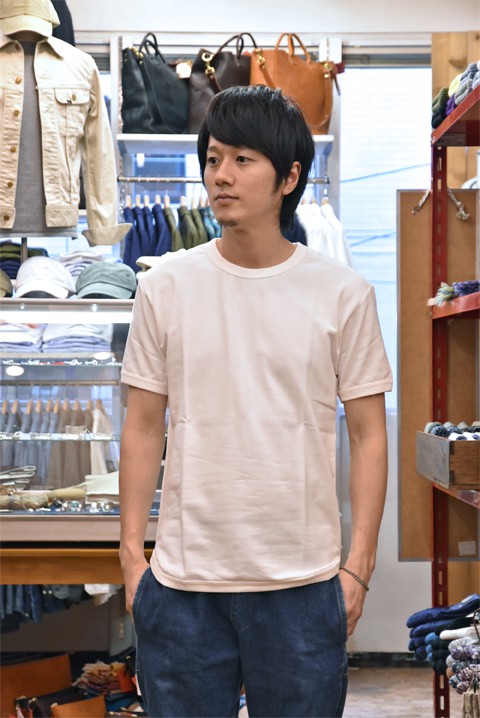 袖、裾にリブが付き半袖スウェットのような雰囲気で着ていただけます。Tシャツとスウェットの中間くらいの生地は着心地、肌当りが良くついつい手の伸びる一着でございます。