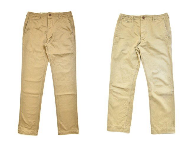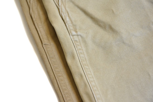 ●ジャケット Vincent et Mireille(ヴァンソン エ ミレイユ)  サイズ:40  ¥21,060- ●シャツ SERO(セロ)  サイズ:15(M)  ¥11,664- ●パンツ Double Tree(ダブルツリー)  サイズ:30  ¥18,144- ●シューズ USED(古着)  ¥8,640-の50%OFF⇒¥4,320- 身長175cm 体重65kg 足約25.5cm 左が新品、右が着用約2年の私物です。 1940年代のミリタリーの生地を再現したヘリンボーンを使用しており、穿き込んだことにより生地の凹凸感がよりはっきりと表れています。 こちらもチノパン同様、両サイドが巻縫いのチェーンステッチで仕上げられていることからパッカリングも荒々しく発生しています。
