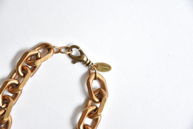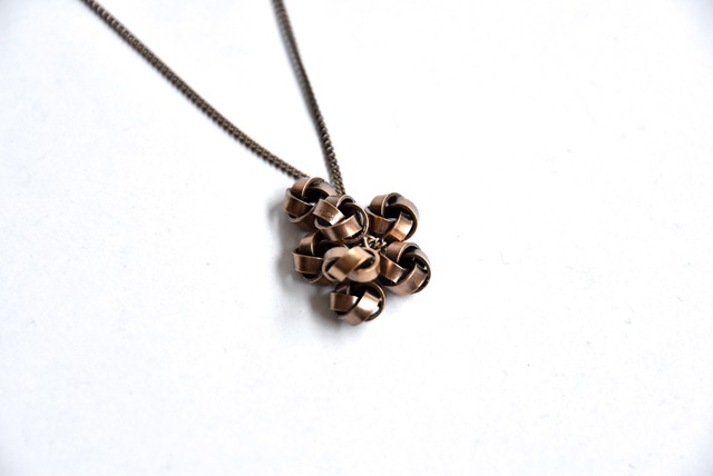 トップは銅プレートを玉状にねじった様な変わり種デザイン。首元にかけると7つに連なっていた銅玉が中心に集まり、程よいボリューム感があります。チェーンには真鍮にヴィンテージ加工を施しています。