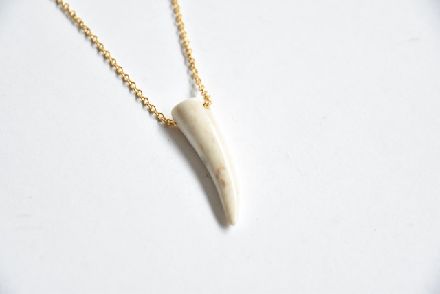 動物の牙をモチーフにしたトップは綺麗に整えられ艶っぽいです。チェーンには金メッキ加工を施した真鍮を使用しております。