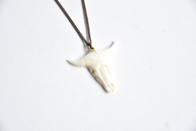 動物の骨をモチーフにしたトップは荒々しい表情ながらも、小ぶりなサイズ感でさりげない存在感に。チェーンには真鍮にヴィンテージ加工を施しています。