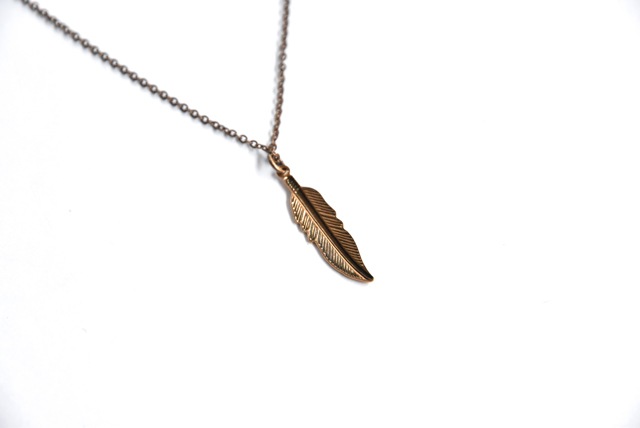 鳥の羽をモチーフにしたトップは真鍮に銅メッキを施しています。また、チェーンには真鍮にヴィンテージ加工を施すことで、マットで重厚感のある輝きとなり、クラシックな雰囲気を纏った仕上がりです。