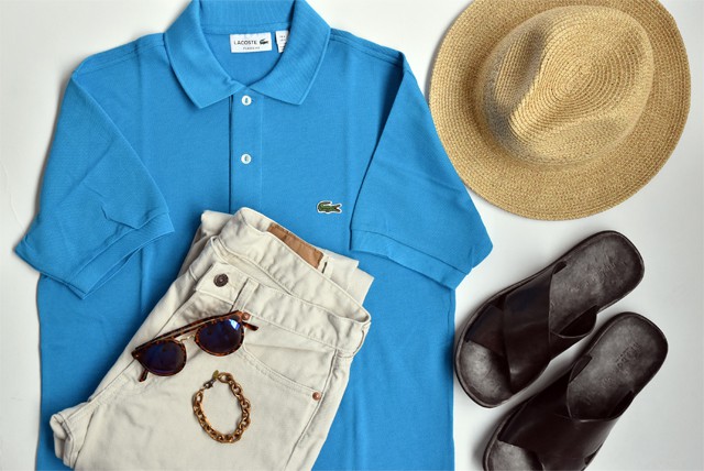 元祖ポロシャツ、ワニのマークでお馴染みのLACOSTE(ラコステ)は夏らしいポップなカラーがおすすめです。そこに爽やかなオフホワイトのピケ素材のジーンズDouble Tree(ダブルツリー)。レザーサンダルは上質な牛革を使用し職人によってハンドメイドで作られたイタリア製のクールなサンダル。ジェントルマンにピッタリの代物かと。