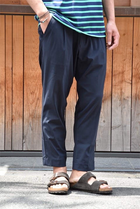 シルエットはテーパードの効いた細身のトラウザー型でキッチリ綺麗に美脚。ウエストはドローコードで余裕、軽快感のあるクロップド丈と、今の気分にもマッチしたパンツなんです。