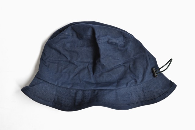 同じく、撥水効果のあるパラフィン加工を施したバケットハットタイプの帽子。使い始めは少し硬い生地感ですが、アタリがついて経年変化も楽しめます。サイズ調整も兼ね備えたドローコードを使い、丸めてゴムで留めればコンパクトに収納できます。細かな気配りにセンスを感じますよね◎